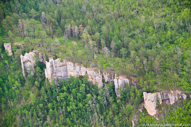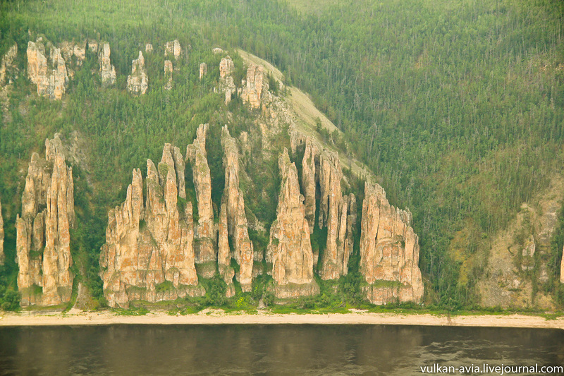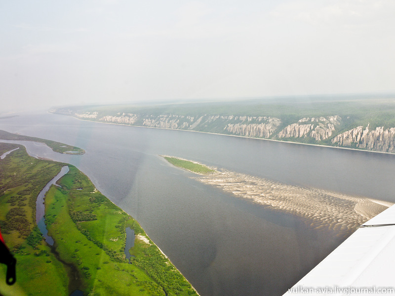 Летим над Леной Как же жаль, что всё в дыму! Волнуюсь, что из-за дыма может не получиться увидеть Ленские столбы - уникальные места, представляющие собой тянущийся на многие километры вертикально вытянутых скал. Высота скальных образований доходит до 100м. Но вот они!