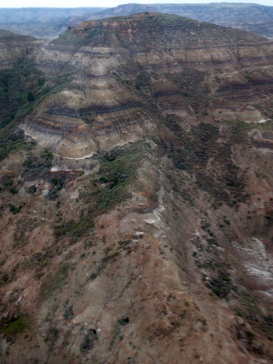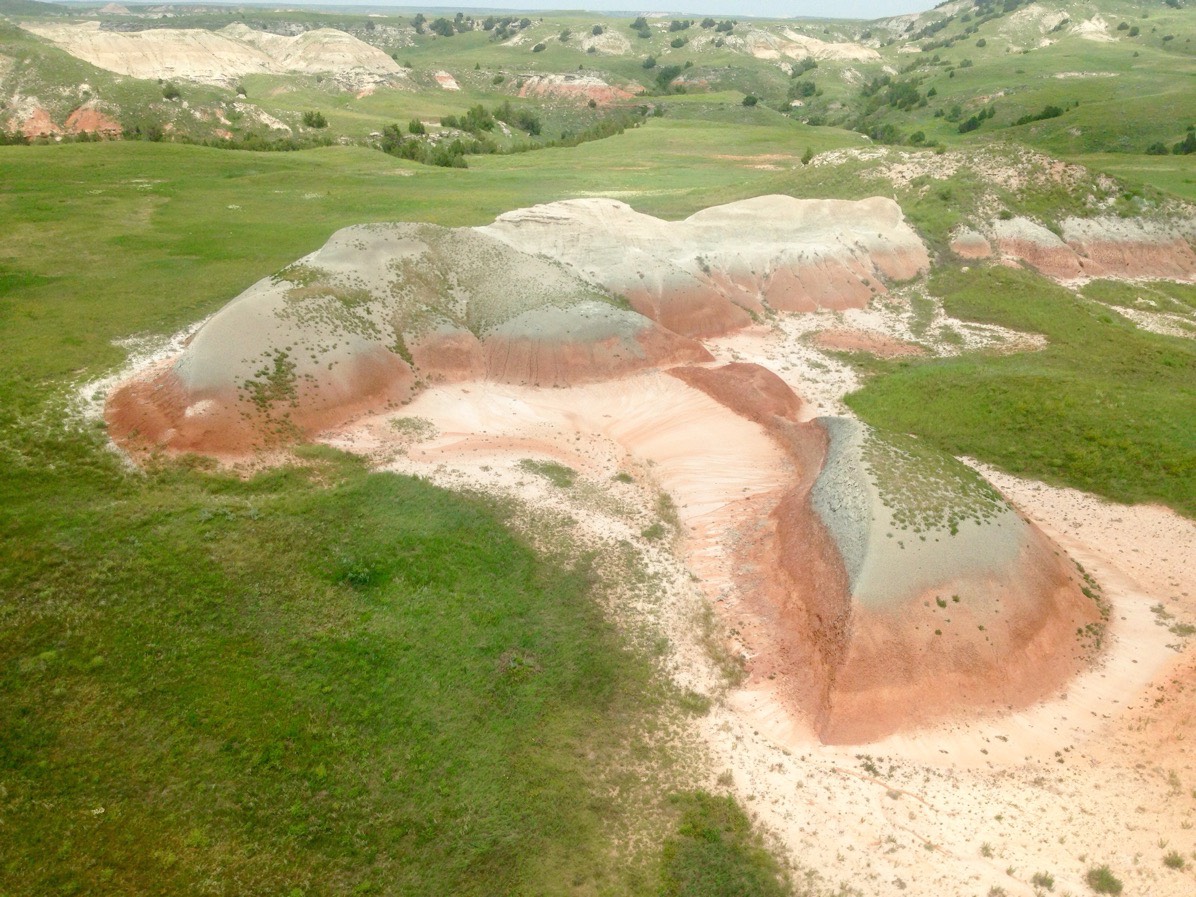 После дозаправки погода окончательно испортилась и до Башни Дьявола (Devil tower) я так и не дошел. Хотел, но дождь превратился в какой-то тропический ливень и горы закрылись тучами. Отвернулся в сторону крайнего на этот день объекта: национального парка Теодора Рузвельта. Парк оказался опять про занимательную геологию. Очень причудливых форм вспучения на земной поверхности. Будто древние гейзеры изливали содержимое недр и так застыли. Шапки многочисленных холмов имеют разноцветный концентрический окрас.