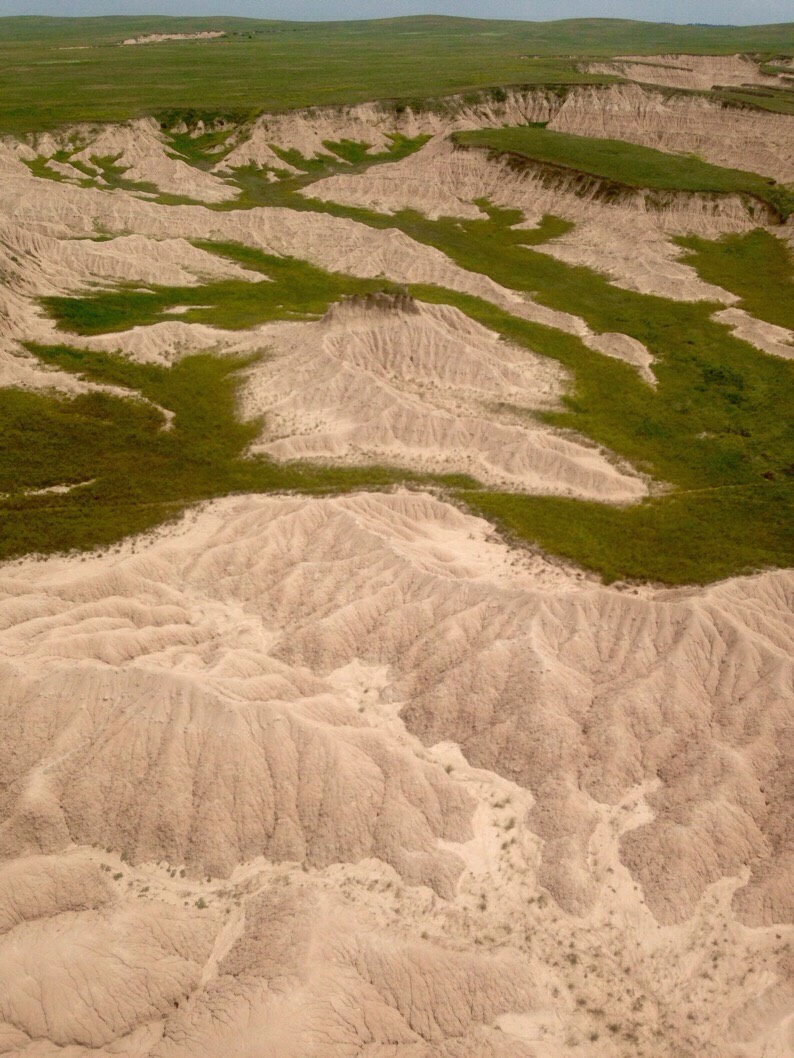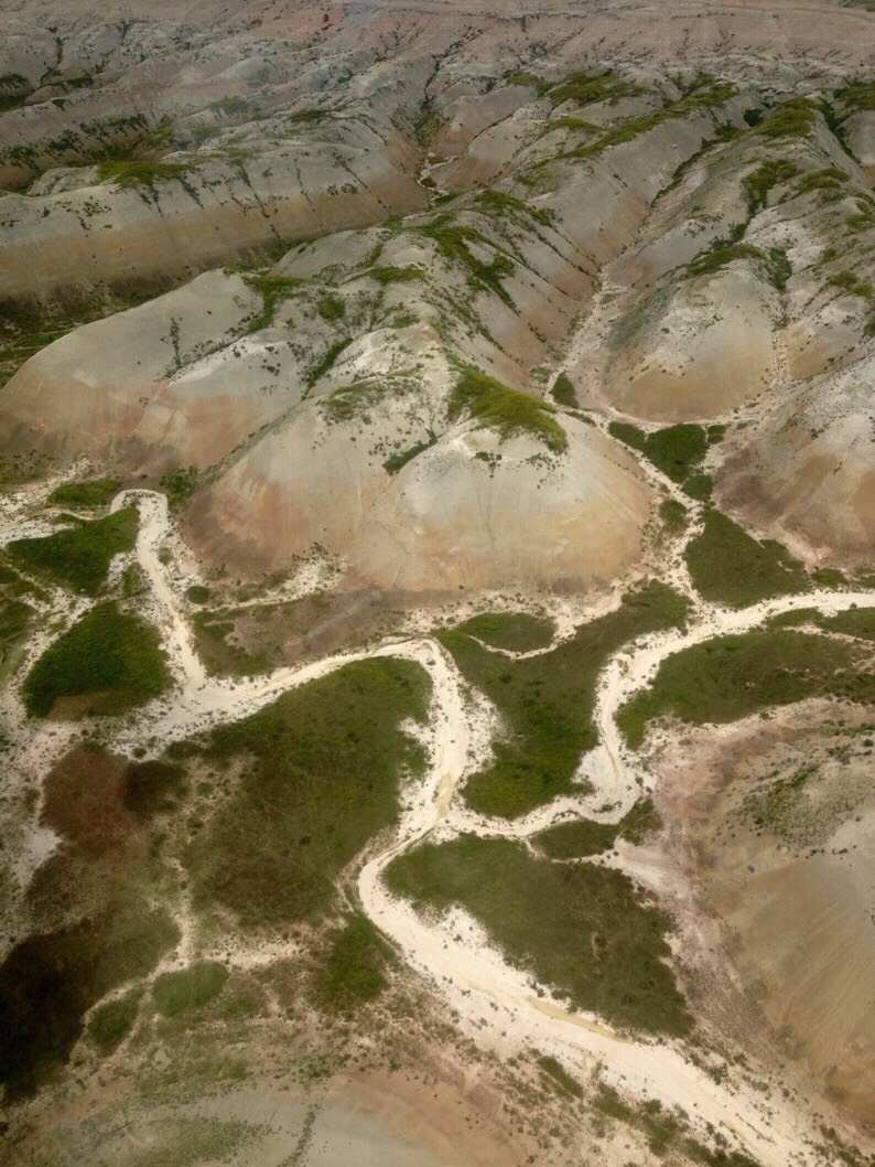 На следующий день, предстояло облететь сразу несколько интересных мест. Начал со знаменитых в этим местах Badlands (действительно "плохие земли"). Мы бы сказали "неудобья". Но красиво. Розовые глубокие каньончики, настолько часто изрезанные, что перестаешь понимать, овраги это или горы. А стены каньонов подвергнуты настолько причудливой эрозией, что создается фантастическая картина другой планеты.
