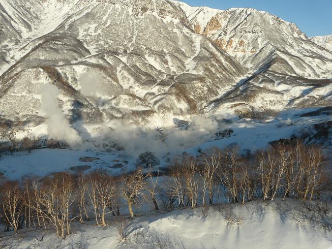Первую и единственную посадку мы совершили в кратер вулкана Узон. Тут совсем недавно( забыл сколько тысяч или миллионов лет назад) было мощное извержение. Вулкан взорвался нафиг и кратер превратился в долину с серно-кислотными озерцами и родничками :). Запах очень даже знакомый. В Капотне бывает сильнее. Долину охраняют смотрители и гиды. У них есть спутниковый телефон, бензогенератор, снегоходы и кажется это всё. Добраться сюда можно только на вертолёте. Нам провели небольшую, но очень интересную экскурсию. Оказывается, фильм "Земля Санникова" снимался именно тут. Один из самых любимых мною в детстве фильмов. А я смотрю, пейзажи знакомые какие то. :)
