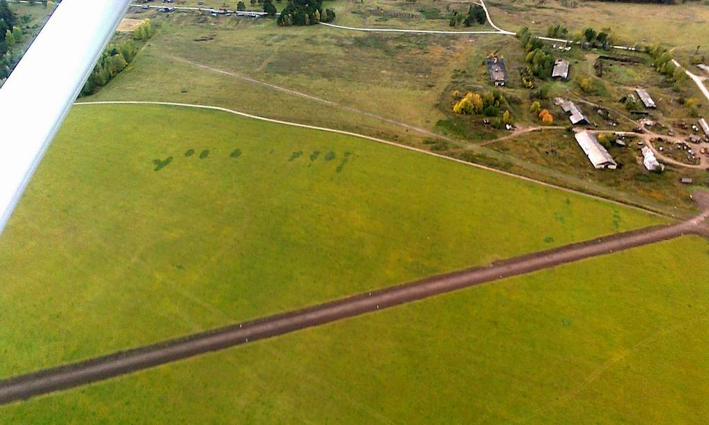 твердый грунт,травянистое покрытие, ВПП 600,600 и 400м.Подходы открытые.