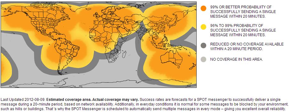 При нажатии кнопки над тобой всегда есть спутник(и), но т.к. у спутников нет "памяти" на сообщение от мессенджера, то для того, чтобы приземлить твой сигнал, в прямой видимости от спутника в данный момент должна быть базовая станция. Этим и определяется покрытие. Зависит от конкретного положения спутника - где он над горизонтом в момент передачи сообщения. После активации мессенджер посылает несколько повторов. Это я к тому, что чем дальше от базовой станции, то тем меньше шансов, что сообщение дойдет, но вероятность все-же есть. На северном полюсе - согласен, работать вроде не должен.