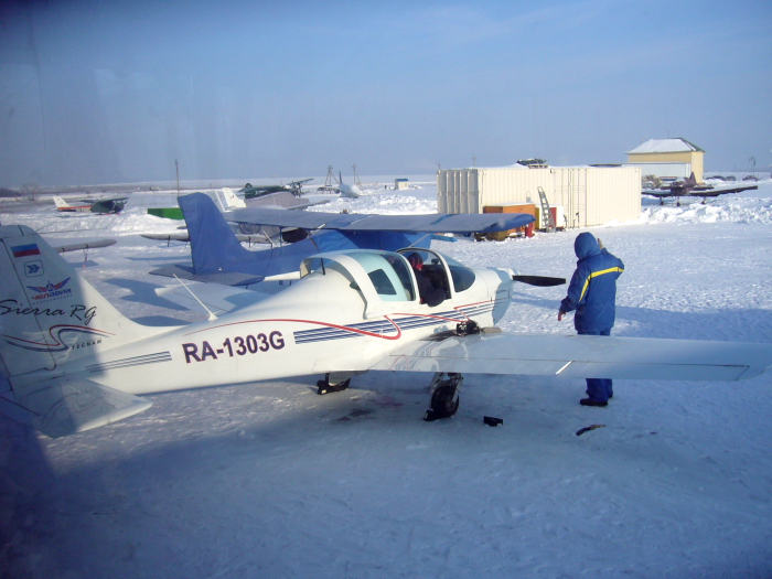 По возвращению инструктора Сергея Ивановича мы поднимаемся в небо на Сиерре с убирающимися шасси и автопилотом. Летим к Воскресенску по маршруту, инструктор показывает мне работу по изменению шага винта, его затяжелению. Видимость не очень, высоту я выдерживаю сам а автопилот выводит нас на нужный курс. :wink: Полетав около 20 минут, возвращаемся на аэродром. На глиссаде самолет слегка подбрасывает из стороны в сторону, но посадка проходит четко. «1303, полосу освободил». На скользкой рулежке Сиерра вполне предсказуема.
