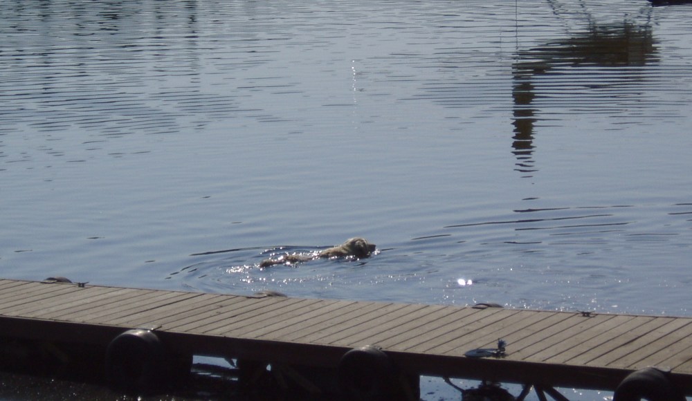 обстановка в целом очень приятная и, в некоторой степени, даже семейная - Don с женой радушны и гостеприимны ... их собаки носятся по территории и готовы поиграть со всеми ... вот 8-ми месячный Boomer носится за мальками в озере, заодно принимая охлаждающие ванны ...