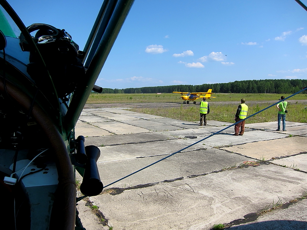 Оперативно подвезли топливо и масло, все экипажи работают споро. Очень выручают два маленьких автономных насоса, что летят на Як-12 Александра Андреева. Втыкаешь в канистру заборник, щелчок тумблера, несколько минут и бензин в баке. В По-2 и в Яке, помимо бензина в двигатель доливается масло