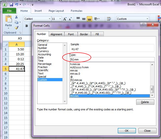 Спасибо за картинку, теперь у меня корректно заработал подсчет в Экселе. Изюминка скрывалась именно в формате данных. Алгоритм действий получился у меня такой: всем полям и для слагаемых и для суммы присваиваю формат с квадратными скобками [h]:mm , затем ввожу в поля в столбец исходные данные (налёт), выделяю слагаемые, жму кнопку СУММА в панели меню - и в итоге получаю нужный расчёт. Замечательно.