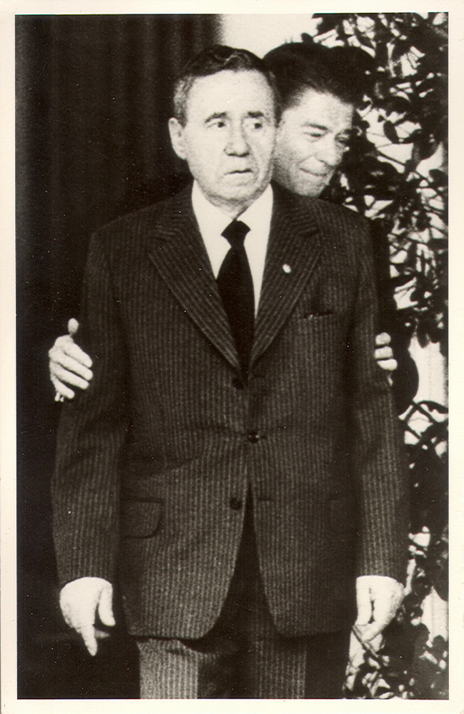 Не удержавшись, выкладываю «диптих» со встречи А.Громыко и Р.Рейгана 1984г. Фотографии явно не публичные. На втором – занимательно выражение лица министра иностранных дел, неожиданно оказавшегося в «дружественных» объятиях американского президента.