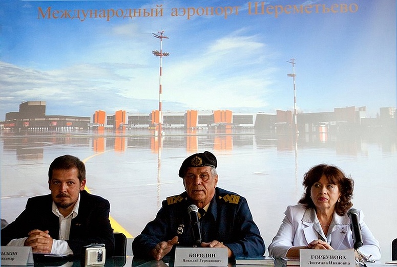 Когда гости собрались, им предложили пройти в пресс-центр. Частный пилот Александр Маковецкий из компании ЧелАвиа По традиции мероприятие открыл начальник пресс-службы аэропорта Роман Генис. Гостям были представлены: Александр Швыдкин ("Пилот-ТВ") - ведущий пресс-конференции Николай Германович Бородин - директор исторического клуба и основатель единственного в мире музея "Союзники и Ленд-лиз" В своей речи он рассказал о музее которым руководит, о том каких неимоверных трудов стоило собрать уникальную коллекцию предметов ленд-лиза, о людях предоставивших в дар эти вещи, но особое внимание он уделил тому, что не стоит принижать значение союзнической помощи в это тяжелое для страны время. Людмила Ивановна Горбунова - руководитель секции ветеранов "АЛСИБ" Российского комитета ветеранов войны и военной службы, член Международной ассоциации писателей, Союза славянских журналистов, Красноярского землячества в Москве. Автор, автор-составитель и редактор около 30-и печатных трудов, в т.ч. десяти книг по истории военной и Полярной авиации. Лауреат Всеросийских конкурсов Союза журналистов РФ, минобороны РФ, Международной ассоциации писателей, Международного Союза журналистов. Людмила Ивановна Горбунова рассказала как по крупицам собирается информация о АЛСИБе, о людях которые участвовали в строительстве этой легендарной трассе, о пилотах, которые в сильные морозы рискуя своими жизнями спешили перегнать самолеты на запад, ближе к линии фронта...