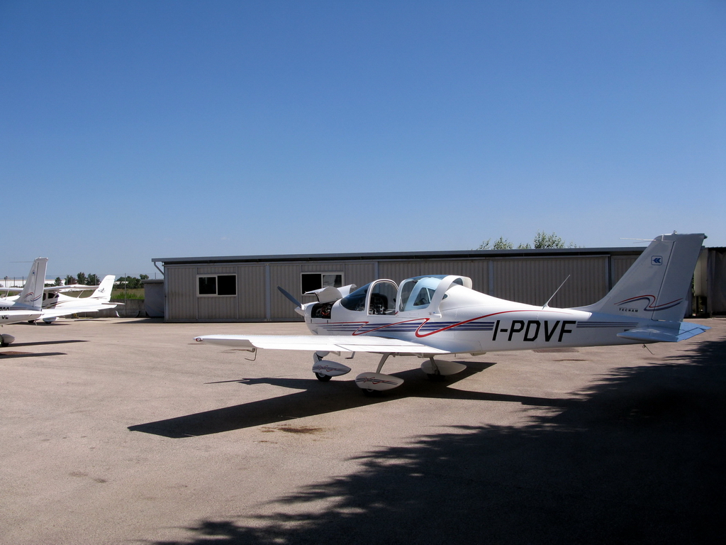 Запускаемся и греемся. Быстро забиваю в гармин ближайшие точки маршрута. Поехали….мы рулим первыми, на радиочастоте местного аэродромчика идет какой-то радиообмен на английском и итальянском. На полосе сидит самолетик, не взлетает. Мы стоим на предварительном, проверяемся, самолетик, убедившись, что мы ему на полосу не вылезем, начинает разбег, отрывается и уходит в жаркое небо. Выруливаем и трясемся по неровностям, чтобы занять исполнительный, надо порулить по всей полосе. За нами рулят RA и Foxtrot, занимаем исполнительный, соответственно при развороте Foxtrot оказывается лидером, RA за ним, ну и мы сзади. Еще одна проверка, подтверждаем готовность и Foxtrot начинает разбег. Взлетает тяжеловато – жарко, полные баки, начинает неспешный набор высоты. RA начинает разбег, отрывается, наступает наша очередь, газ вперед, побежали. Скорость растет медленно, самолет начинает уходить с полосы – ветер чуть сбоку, подпрыгивает, еще раз тыкается колесами об землю и переходит в набор. Наше путешествие началось…..
