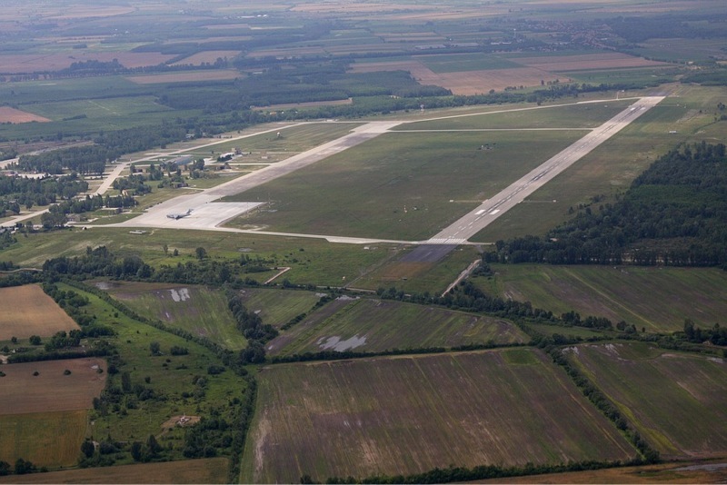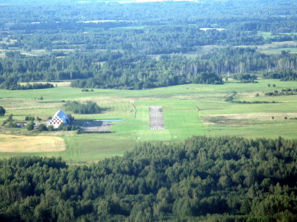 Группа идет все более и более тесным строем - потеряться сейчас раз плюнуть. Очень хочется долететь до порта назначения, но погода явно не способствует. Условия визуальные пока еще есть, но совсем совсем на грани. Начинаем снижаться, внизу вроде как лучше видно. Диспетчер тут разрешает все - да и летаем, судя по всему, только мы. Кто еще в такую погоду сподобится....Каунас передает нас Вильнюсу, в этот момент Миша спрашивает меня о чем-то, забивая передачу, где ведущий говорит новую частоту. Ведущий переходит на другую частоту, опс....а на какую переключаться ? Запрашиваю его на предыдущей частоте - тишина. Еще раз - тишина. Вот засада. И что тебе Миша не молчалось..... да и эти хороши - договорились же перед сменой частоты всегда ее подтверждать. Торопится ведущий, нервничает. Минуты через 3 возвращается на нашу частоту и дает новую. Вот так легче, а то я уж полез по искать, где ее можно взять. Продолжаем понемногу снижаться, дождь усиливается, идем совсем близко. А то точно потеряемся. Начинаю смотреть, как расположены полосы на аэродроме посадки - какую полосу рассчитывать по тому ветру, что у нас сейчас. Отчетливо видно, что ведущий ведет нас правее того курса, который дает GPS на порт назначения. Миша спрашивает в эфир - какая полоса для посадки. Ведущий не отвечает, запрашивает Вильнюс о смене частоты на частоту порта посадки. Диспетчер разрешает. Ведущий дает направление полос совершенно не соответствующих тому порту, который у нас забит в GPS и подан в плане, как destination. Идет дождь, мы уже совсем низко над елками, видно пока еще нормально, и тут мы вываливаемся прямо над КТА какого-то аэродрома (фотография с другого полета). Фууууух а я уж думал, что придется уходить в международный порт Вильнюса, ибо погода уже совсем совсем не визуальная. Только наличие хорошей системы навигации на борту и успокаивало все это время - если чего - ушли бы в порт, который оборудован курсоглиссадной системой, есть все нужные для захода огни полосы. Ну точно не потерялись бы и сели бы даже в таких поганых метеоусловиях