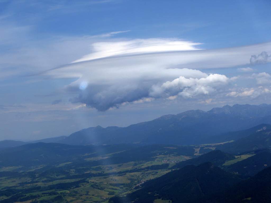 Справа видно интересное образование - облако-линза, встречается в горах, когда образуются т.наз mountain wave - неприятная штука, стоячая волна, которая стоит за горным хребтом на много километров и достает до стратосферы, в ней может нехило поколбасить и на верхних эшелонах. Но красиво !