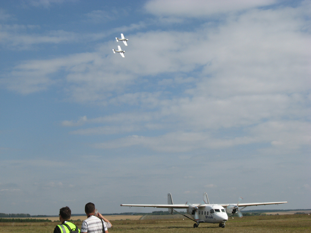 Мы с Игорем (aka igor113) были поражены масштабом и организацией мероприятия: тысячи человек народу, автобусы с детьми и учителями, милиция, баннеры, какие-то мега-буквы для флэшмоба, а главное авиационный дух и праздничная атмосфера: летают авиамодели, управляемые как детьми из авиакружков, так и их наставниками, можно посмотреть на модели сблизи или купить себе наборчик для занятий на досуге. Летают самолеты и вертолеты, прыгают парашютисты - весь день кто-то в небе. Красивейшие девчонки фотографируются на фоне всем нам хорошо известных Як-ов, Цессен и прочих летательных аппаратов. Наш Мушкетер тоже не обходят стороной. Вот кто-то подходит и интересуется, можно ли прокатиться, а кому-то интересно и научиться. И они отправляются... Известно куда - в некий всем известный АУЦ, директор которого, как и подобает настоящему авиатору, в это время, зажигает на Бланике :)