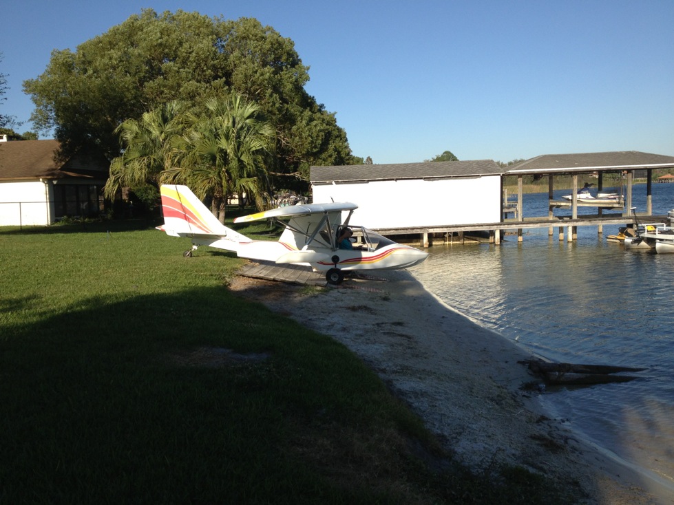 Интересующая нас лодка стояла на заднем дворе частного дома одного из работников кооператива. Поразила простота использования ВС - он завел ее как мопед, и с личного пляжа съехал в воду… Далее после короткого пробега взлетел. Скорости у нее конечно не большие, 80 миль/час, но в качестве дальнобойного ВС его никто и не рассматривает, это исключительно досуговый аппарат, которому больше скорости и не надо. За счет легкости его пробеги и разбеги минимальны. Зимой можно поставить на лыжи и летать практически из любого сугроба ☺)))