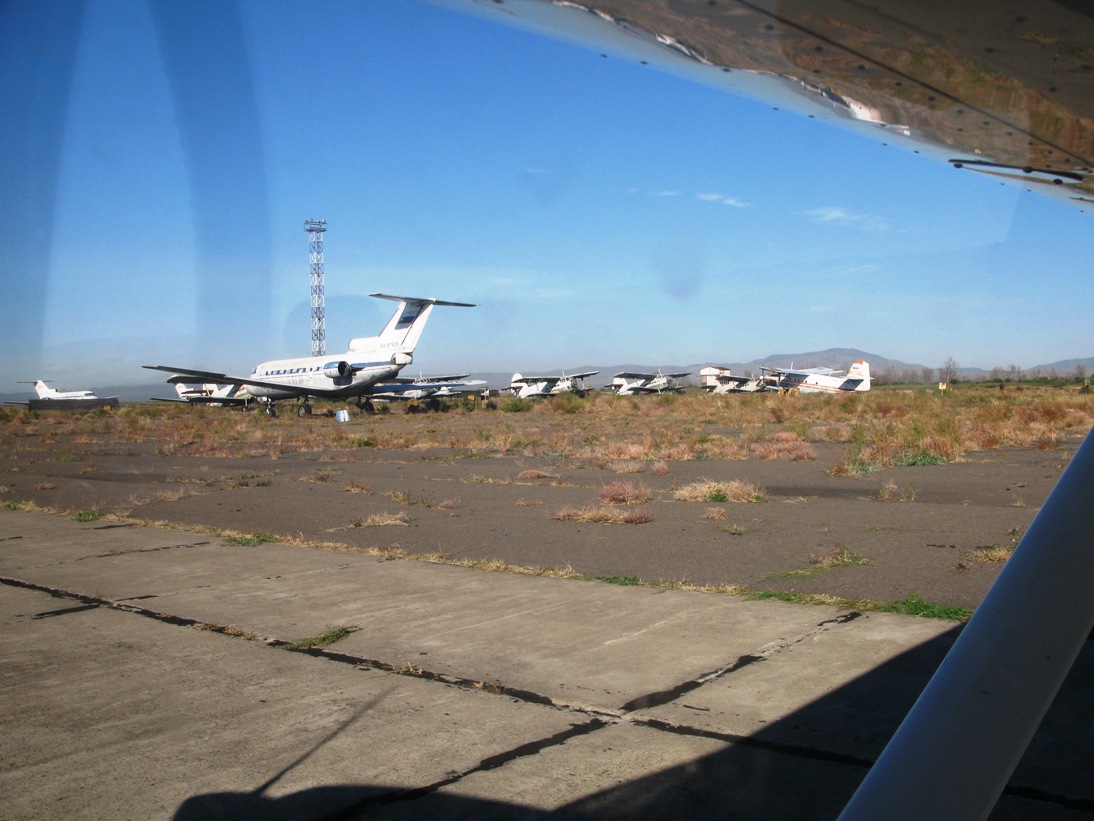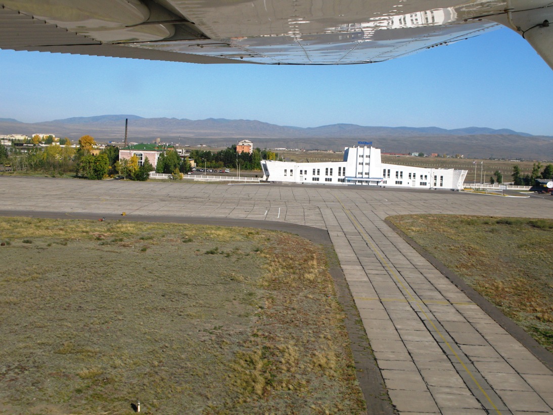 подхожу к аэропорту г Кызыла, аэропорт как и город среди гор, большие самолеты по спирали очевидно делают заход, полоса около 3 км, по привычки сел в начале полосы,