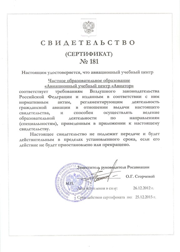 Авиационный Учебный Центр "АВИАТОР" продлил срок действия Сертификата АУЦ №181 до 25.12.15, со всеми предыдущими видами подготовок.