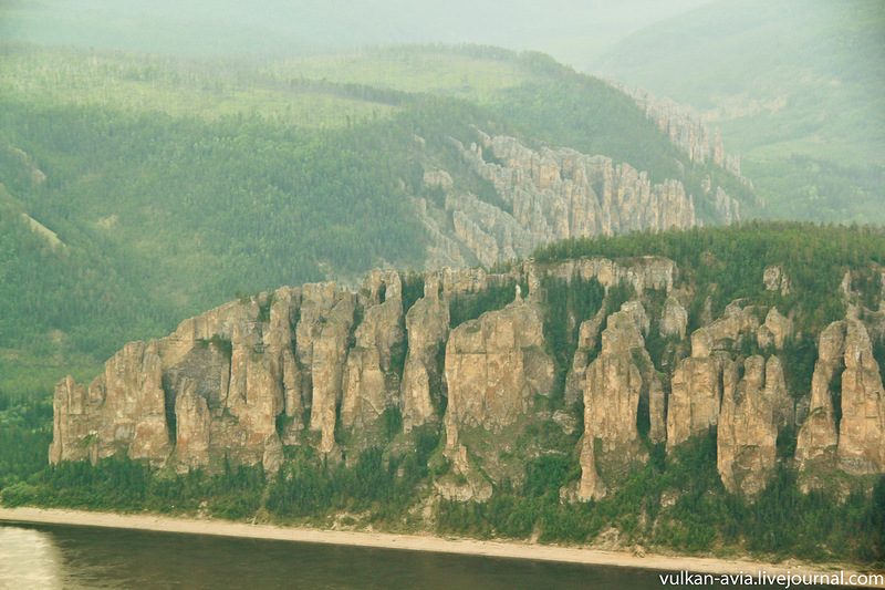 Летим над Леной Как же жаль, что всё в дыму! Волнуюсь, что из-за дыма может не получиться увидеть Ленские столбы - уникальные места, представляющие собой тянущийся на многие километры вертикально вытянутых скал. Высота скальных образований доходит до 100м. Но вот они!