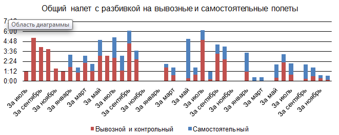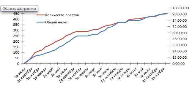 Тут видно как на начальном этапе обучения количество полетов растет быстрее общего налета (долбили круги), а затем один график догоняет другой. По идее, дальше общий налет должен расти быстрее, а количество полетов - медленнее (длительные маршруты). Но так не происходит - кривые идут вместе,