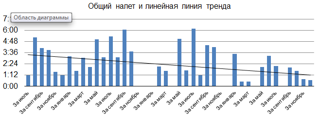 Уже два с лишним года летаю для собственного удовольствия, когда могу себе это позволить - в основном зоны и короткие маршруты и круги, для поддержания навыков. Общий налет за три с половиной года - под 100 часов. Своего самолета у меня нет, арендую у старших, так сказать, товарищей. Вроде все в порядке, но.... Свою ЛК я изначально вел в Excel, поэтому построить графики было несложно. Посмотрев на них, я увидел довольно печальную картину. Судите сами: