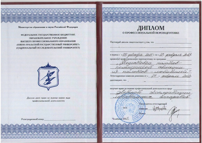 Добрый день! Подготовка пилотов до уровня CPL, осуществляется на основании лицензий, сертификатов выданных уполномоченными органами (Министерство образования РФ, Министерство транспорта РФ) и соответственно реализуется по утвержденным программам частно-государственным партнерством, а именно «Национальный исследовательский Южно-Уральский Государственный университет» (г.Челябинск) + «Уральский учебно-тренировочный центр гражданской авиации» (г.Екатеринбург) + Авиакомпания «ЧЕЛАВИА» (г.Челябинск).eko26 писал(а): Добрый день! А можете сообщить о дипломе поподробнее, какая квалификация присваивается курсанту по окончании данного курса и по какой специальности ?