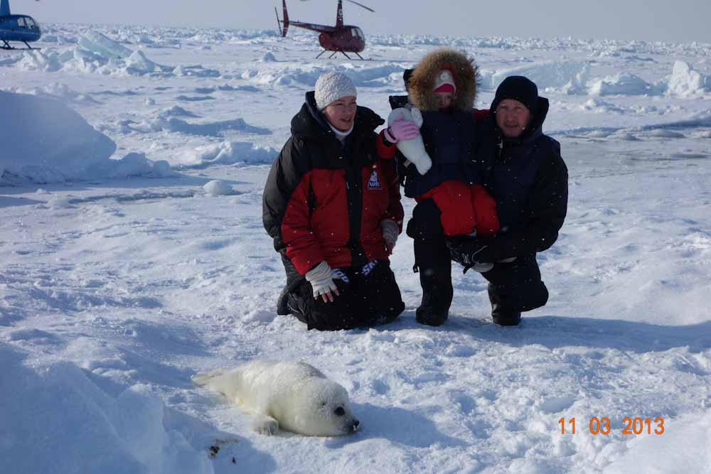 12 марта вылетали на льдину при прекрасной погоде везде! Сплошное удовольствие! Вообще, когда находишься на льдине, ощущение необычное. Дрейфуешь с тюленями потихоньку в полной тишине в нескольких километрах от берега вместе с вертолетом.... Нюся быстро запросилась на берег: " Давайте оставим бельков в покое, пусть их кормят мамы!"