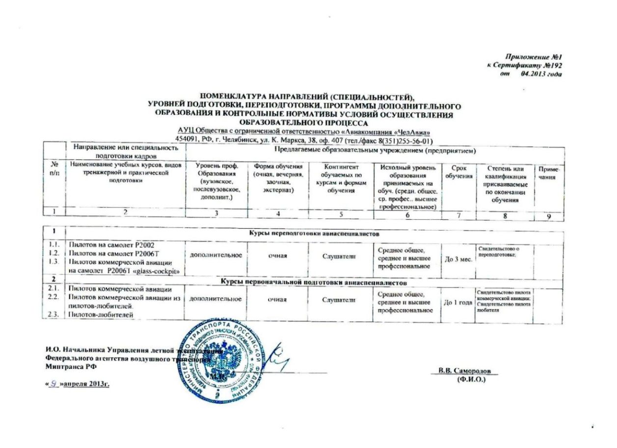 На основании вышеизложенного АУЦ ООО "Авиакомпания "ЧЕЛАВИА" совместно с ГОУ ВПО "Южно-Уральский государственный университет" + "Уральский учебно-тренировочный центр гражданской авиации" проводит обучение по программам подготовки пилотов коммерческой авиации кандидатов из числа выпускников средних, высших технических учебных заведений с прохождением итоговой Государственной аттестации и выдачей диплома о профессиональной переподготовке по специальности «Летная эксплуатация летательных аппаратов».