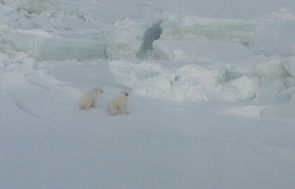 По пути на Средний мы с Димой впервые в жизни увидели во льдах белую медведицу с двумя медвежатами и сделали несколько снимков. Летевшие в Ми-8 другие участники экспедиции потом страшно нам завидовали. Оказалось, медведи боятся вертолета. Медведица бросила на хрен медвежат и стала убегать. Мы подсели к медвежатам, и Дима вылез со своим айфоном их снимать. При этом мы точно не знали, как далеко находится медведица (обзор закрывали торосы выше человеческого роста), но я был готов взлететь и отгонять ее вертолетом. Через день на Земле Александры мы получили строгий выговор с занесением от директора Национального парка "Русская Арктика" за то, что пугали медведей - и нам стало стыдно. Мы стыдились до тех пор, пока не узнали, как "гуманно" этот сукин сын и его подчиненные сами обходятся с белыми медведями - но об этом в свое время... За день 4 апреля пройдено 1,630 км за 9.1 часа полетного времени.