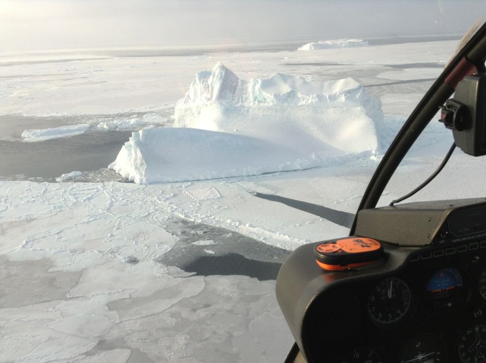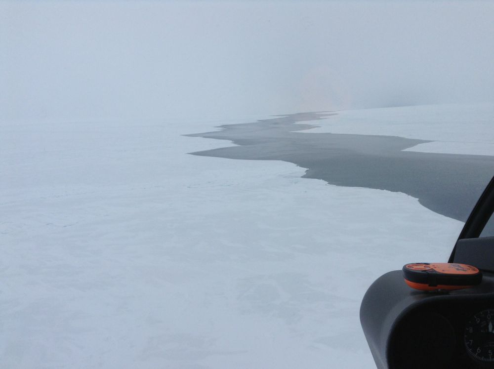 Утром 7 апреля мы вчетвером взлетели с аэродрома. Прикованные «решением командования» к Земле, военные летчики печально провожали нас, не вставая с кроватей (мы с Димой ночевали в одном кубрике с комэска и штурманом эскадрильи). Кроме четырех человек и запаса топлива на 6.5 часов на борту находились наши с Димой НАЗы, некоторый инструмент и три буя килограммов по 10-15 каждый. Вертолет взлетал тяжело, несмотря на плотный морозный воздух и довольно сильный встречный ветер. Мы направились сразу в открытое море и примерно через два часа совершили первую посадку на лед.