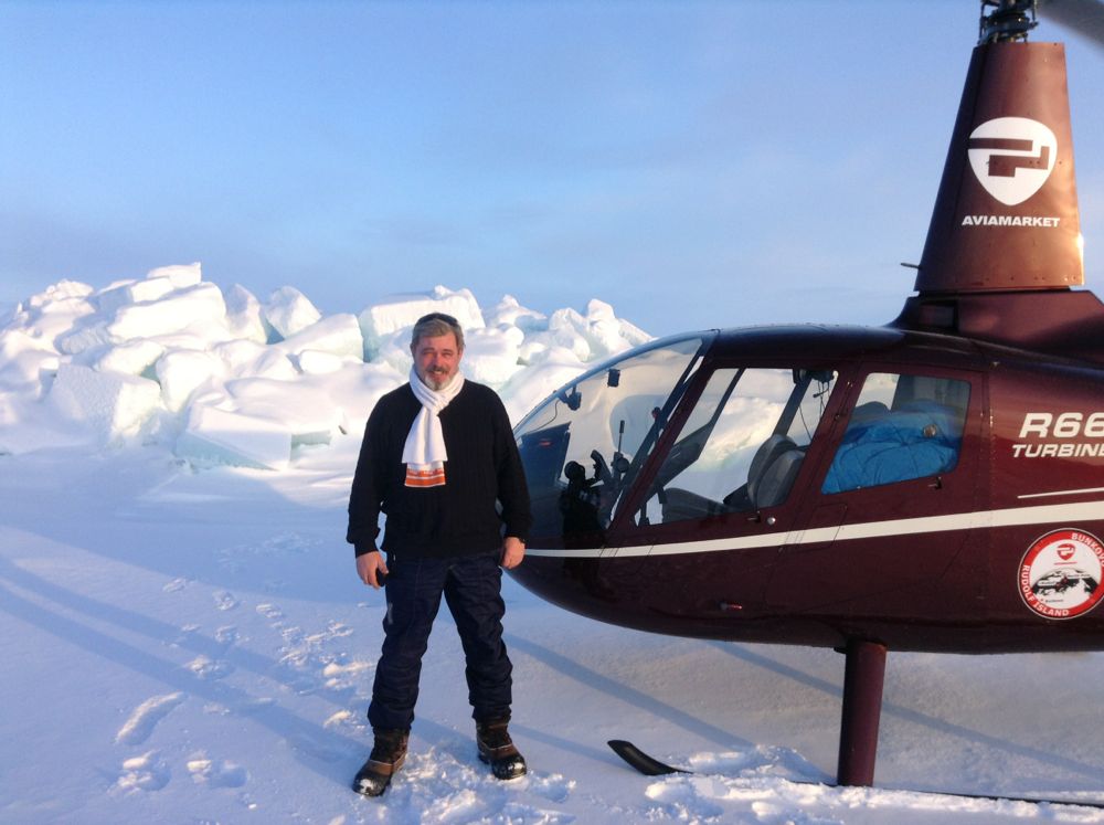 Вообще, до этого полета я не предполагал, что Арктика так разнообразна. Мне казалось, я попаду в бескрайнюю белую равнину, однообразную и без признаков жизни. Я был потрясен увиденным, и каждый час полета открывал мне новые восхитительные виды. Мы видели огромные торосы из голубого и бирюзового льда и не могли даже примерно представить силу, нагромоздившую эти сотни тысяч или миллионы тонн; любовались высокими отвесными стенами ледников, сползающих с островов в море, и айсбергами, которые прежде были частью этих ледников. Мы фотографировали огромных вальяжных моржей с толстыми бело-желтыми клыками и китов, всплывающих на поверхность подышать воздухом; нерпу на льду и белых медведей, поджидающих нерпу у лунок-«продухов»... А как красиво подсвечиваются стены ледников не заходящим за горизонт Солнцем, как красиво само Солнце над горизонтом с эффектом вертикального Гало (световой столб)... В общем, планета наша прекрасна не только на Гавайях или в Гранд-Каньоне, Арктика – одна из жемчужин в ожерелье Природы. Удручает только, что эта жемчужина сильно загажена человеком: на многих островах лежат бочки из-под топлива, брошенная техника, разбившиеся когда-то самолеты – и все это копится в течение последних примерно ста лет. Лишь недавно наши руководители озаботились проблемой очистки Арктики, но я слышал только об обсуждениях – о конкретных делах ничего. По крайней мере, признаков работ по уборке отходов «покорения человеком» этих мест я не заметил. Уже к обеду мы благополучно приземлились на военном аэродроме «Нагурское» на земле Александры, где нам и предстояло выполнить работу в интересах экспедиции. За день мы прошли совсем немного, около 870 км за 4.2 полетных часа – и занялись сортировкой вещей и подготовкой к вылету к месту закладки радиобуев. Однако, логика принятия военных решений иногда отличается от наших представлений. Командир эскадрильи Ми-8 сообщил нам, что завтра, 6 апреля, решением командования они не летают. Поскольку решения командования на нас не распространялись, я подал через Москву флайт-план, и на следующий день мы с Олегом Проданом и оператором Антоном Ждановым совершили «разведывательный» вылет на самую северную точку Евразии – мыс Флигели острова Рудольфа. Недалеко от этого мыса нам вскоре предстояло под многочисленными телекамерами выполнить главную и единственную задачу экспедиции - заложить три радиобуя на дрейфующие льды. По пути на Рудольфа и обратно мы осмотрели еще несколько островов и, кстати, убедились в том, что карты в навигаторах Гармин не всегда правильно отображают их очертания и рельеф. За этот день мы налетали 3.3 часа и прошли 486 км.