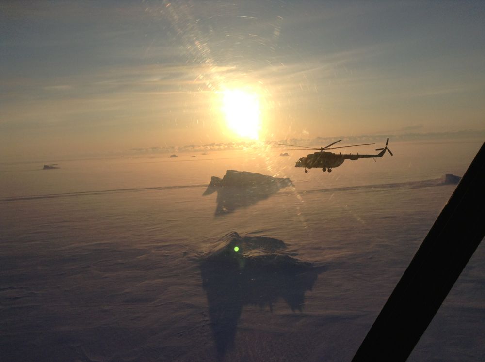 Примерно в 11-00 мск пришла одна "восьмерка" с журналистами и Олегом Проданом. Ребята выгрузили нам бочку и сказали, что пойдут дальше без выключения двигателей. Наше пуско-зарядное устройство было на другом борту, который еще не взлетел с Нагурского. Вертолет простоял на ветру и морозе примерно 40 часов, еще мы использовали наш аккумулятор для перекачки 200 литров керосина из бочки в баки. К нашему удивлению, двигатель запустился от стандартного аккумулятора - это значит, что с батареей повышенной емкости (которыми сейчас Robinson комплектует новые борта) можно летать в любых условиях!