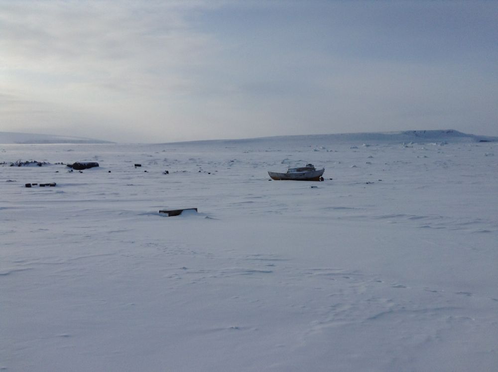 Вот как-то так (когда у меня еще была возможность снимать) Так мы подкрались к Северо-Восточной оконечности Хейса, где находилась полярная станция. Тут сквозь белую мглу мы увидели темные постройки и всякий арктический мусор: самолет, катер, трактора, автомобили и бочки, бочки, бочки... Ориентироваться стало значительно легче - но где здесь живут люди? Дома стояли кругом, опоясывая замерзшее озеро. Домов было очень много (в хорошие времена там зимовало до двухсот человек) - но следов жизни мы не видели. Наконец, заметили свет прожектора из окна одной избушки и собак рядом - и сели напротив.