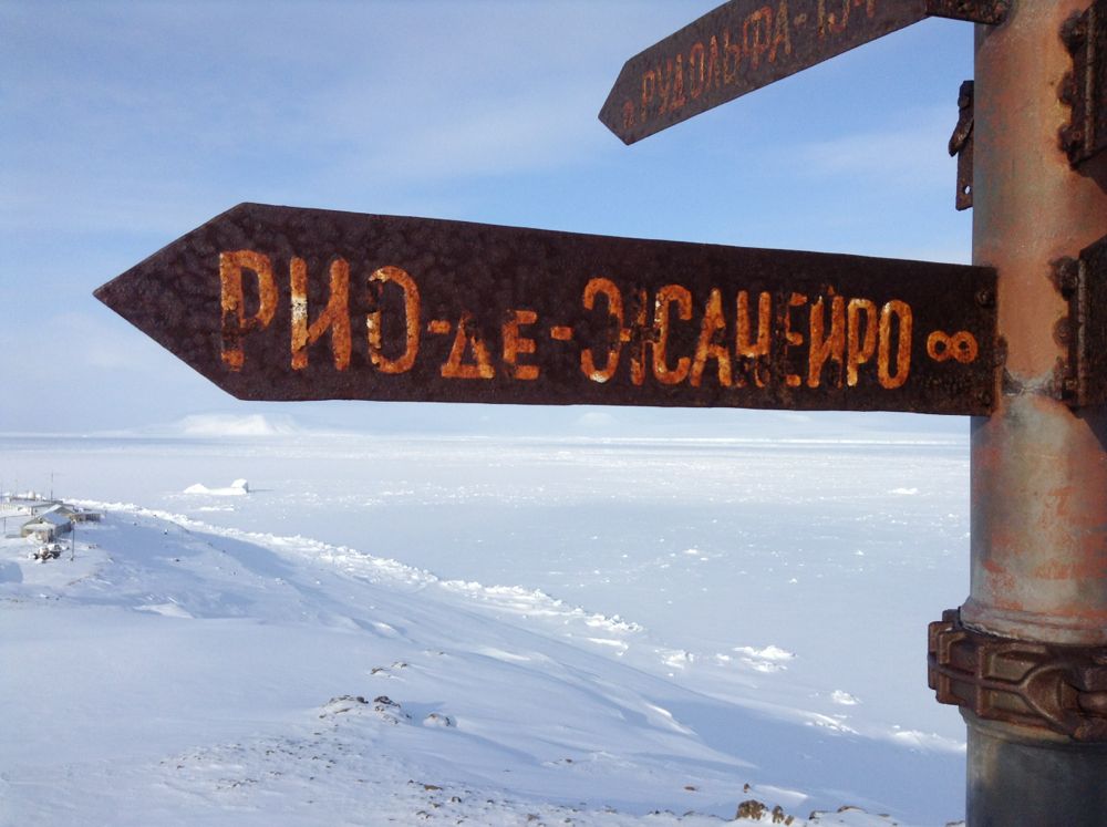 В кают-компании В общем, так мы с Димой зимовали почти двое суток. Наутро 10 апреля решили прогуляться по острову - нельзя же все время сидеть взаперти. С нами вызвались двое добровольцев с ружьями: механик Виктор и работник нацпарка Сергей. Мы взобрались на горку, где стоят разные памятные знаки с нечитаемыми от времени надписями (некоторые - латиницей). Еще там стоит столб со стрелками-указателями расстояний до разных городов мира. Юмор, свойственный людям суровых профессий, проявился в указателе на Рио де Жанейро: вместо цифры нарисован символ бесконечности
