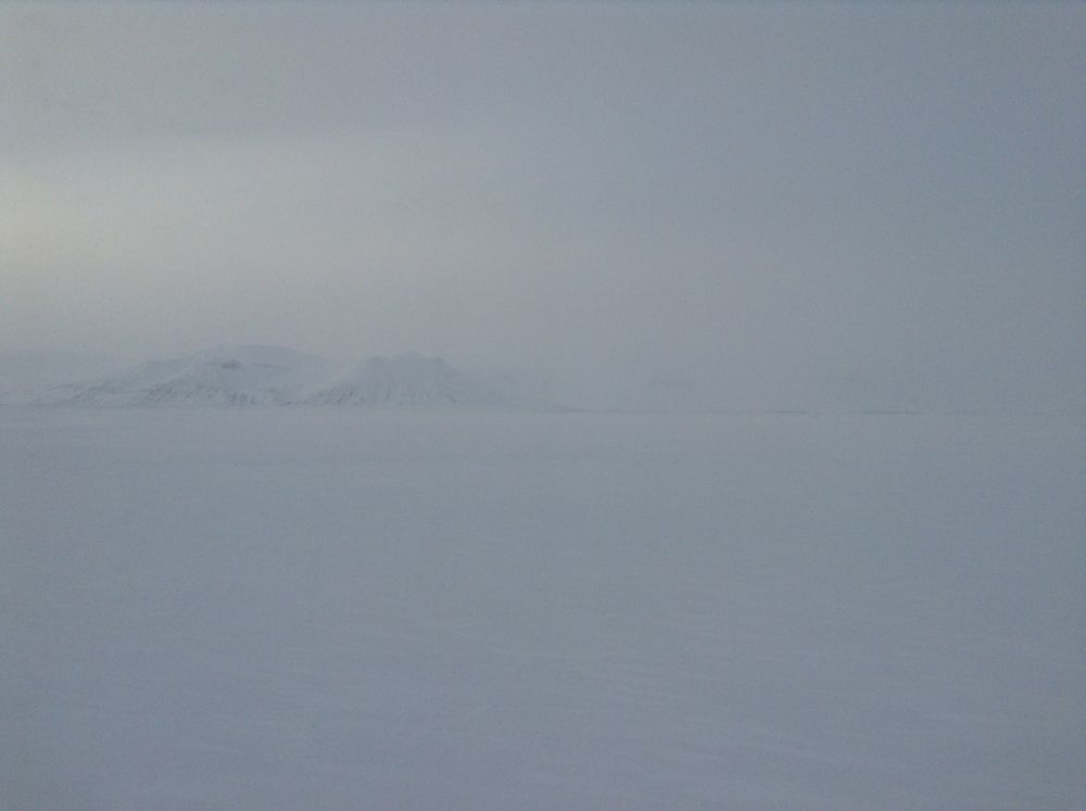 Вот как-то так (когда у меня еще была возможность снимать) Так мы подкрались к Северо-Восточной оконечности Хейса, где находилась полярная станция. Тут сквозь белую мглу мы увидели темные постройки и всякий арктический мусор: самолет, катер, трактора, автомобили и бочки, бочки, бочки... Ориентироваться стало значительно легче - но где здесь живут люди? Дома стояли кругом, опоясывая замерзшее озеро. Домов было очень много (в хорошие времена там зимовало до двухсот человек) - но следов жизни мы не видели. Наконец, заметили свет прожектора из окна одной избушки и собак рядом - и сели напротив.