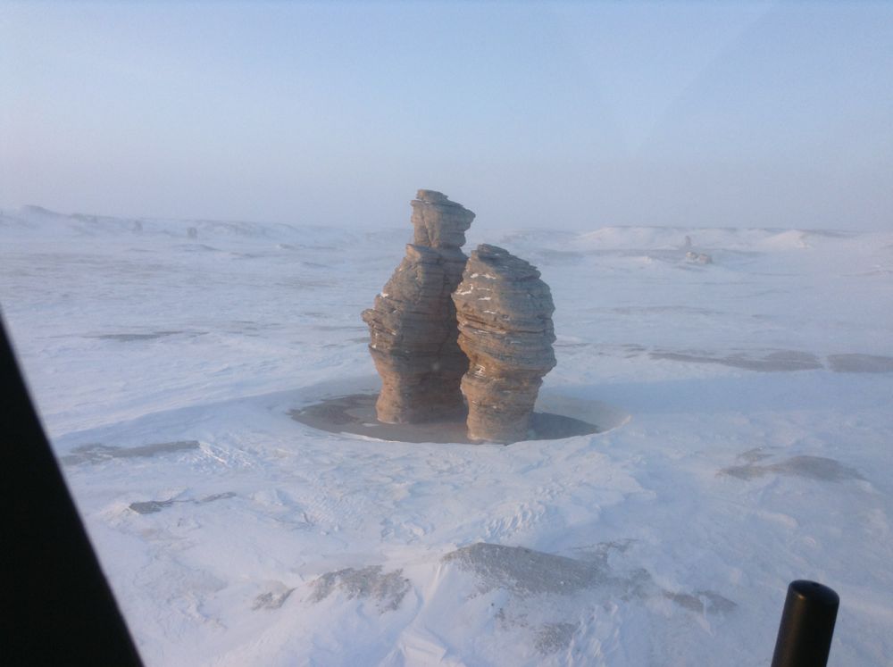Мы с Димой взлетели с Хейса и часа через два следом за командирским бортом сели сначала на Визе, а потом еще через пару часов - возле Столбов Журавлева. Поснимали и пошли на Средний - добрались туда практически на сухих баках (но лампочка еще не горела).