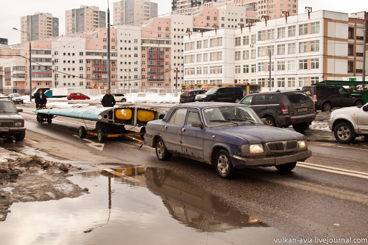 (для справки: размах консоли - 10м, корневая хорда - 3м, вес - 1 тонна) Транспортировка по улицам Москвы Разгрузка На территории КБ Ильюшина