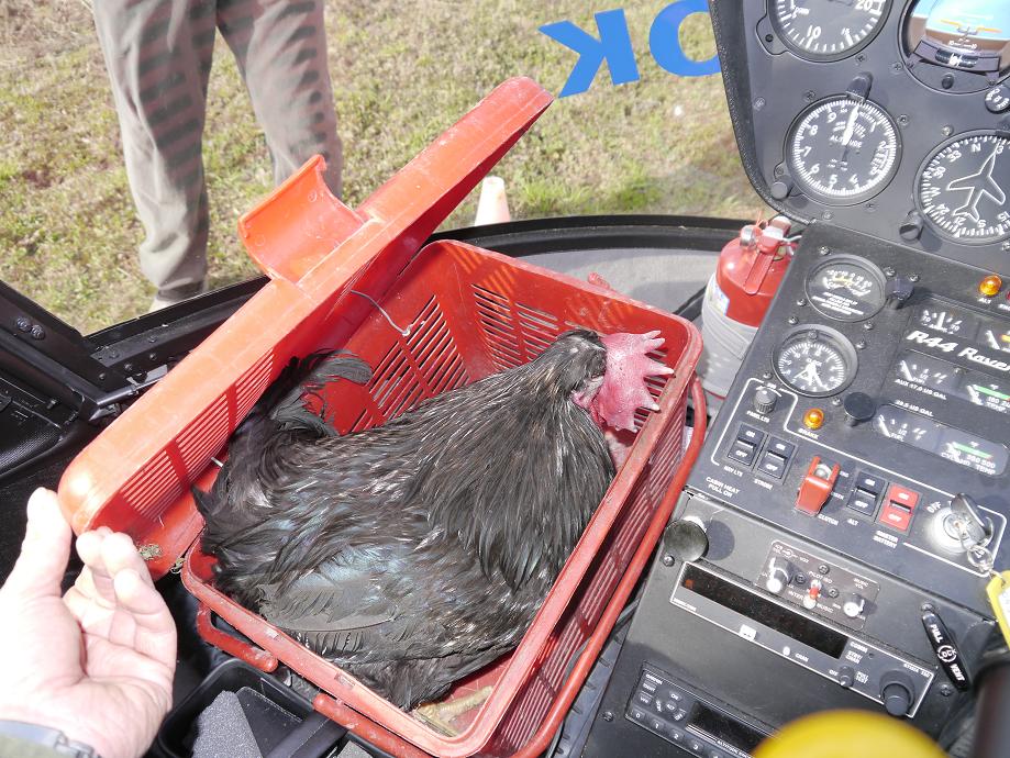 А вы примерно представляете, как выглядят перелётные птицы? Я раньше думал, что знаю почти всех в средней полосе России. Оказывается не всех. Перелётные птицы бывают и такими. Этот петух совершил перелёт к скучающим курам на R-44. Перелётный такой петух. Голос хрипловатый, но с курами подружился. Интересно, он первый из петухов, кто на американском вертолёте летал?