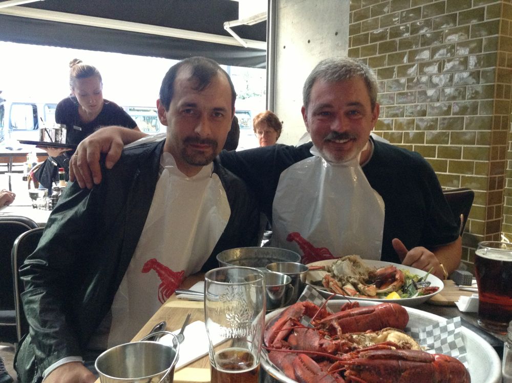 Мы с Olli и его очаровательной женой пожираем всякую морскую нечисть (жена Таня в этот кадр не вошла). Ну и запиваем, конечно