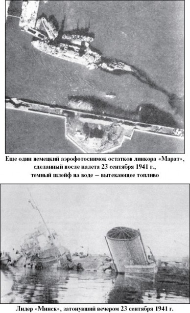 Утром 23 сентября РЛС 2-го корпуса ПВО засекли групповую цель, подходившую с южного направления. Это были 30 Ju-87 из StG2 «Иммельман», летевшие на высоте 3000 метров под прикрытием Bf-109F из JG54. Их отчетливо увидели с линкора «Марат», после чего башня главного калибра № 4 под командованием лейтенанта Н. И. Мухина дала по самолетам трехорудийный залп шрапнельными снарядами с дистанционными взрывателями. Они взорвались высоко в небе, образовав огромные дымные шары. Затем открыли огонь 76-мм и 45-мм зенитки линкора. Все небо окрасилось разноцветными облачками разрывов. Но это не могло остановить немецких пилотов. Сделав заход над базой, штурмовики выстроились в круг, после чего стали поочередно пикировать на корабли.