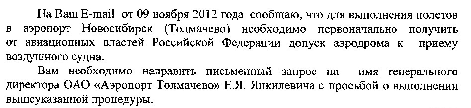 Год назад, 4 июля 2012 года отправил первое письмо в Новосибирский аэропорт "Толмачево", в котором озвучил свое желание прилететь к ним с посадкой.