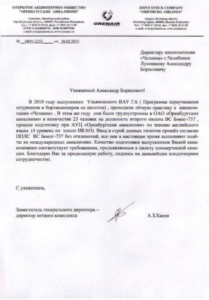 На основании вышеизложенного АУЦ ООО "Авиакомпания "ЧЕЛАВИА" совместно с ГОУ ВПО "Южно-Уральский государственный университет" + "Уральский учебно-тренировочный центр гражданской авиации" проводит обучение по программам подготовки пилотов коммерческой авиации кандидатов из числа выпускников средних, высших технических учебных заведений с прохождением итоговой Государственной аттестации и выдачей диплома о профессиональной переподготовке по специальности «Летная эксплуатация летательных аппаратов».