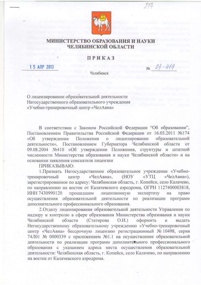 Негосударственное образовательное учреждение "Учебно-тренировочный центр "ЧелАвиа" (НОУ "УТЦ "ЧелАвиа") признан прошедшим лицензинонную экспертизу на право осуществления образовательной деятельности по реализации программ дополнительного профессионального образования!