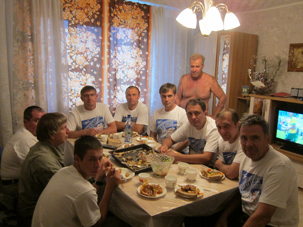 Наша команда за столом, хозяин дома за нами.