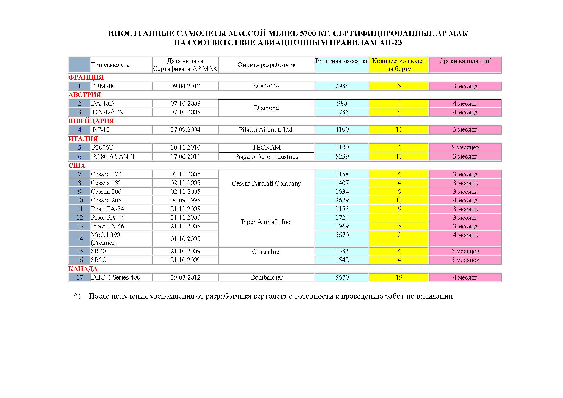 ИНОСТРАННЫЕ САМОЛЕТЫ МАССОЙ МЕНЕЕ 5700 КГ, СЕРТИФИЦИРОВАННЫЕ АР МАК НА СООТВЕТСТВИЕ АВИАЦИОННЫМ ПРАВИЛАМ АП-23: http://www.mak.ru/russian/info/aon/samol_do5700.pdf