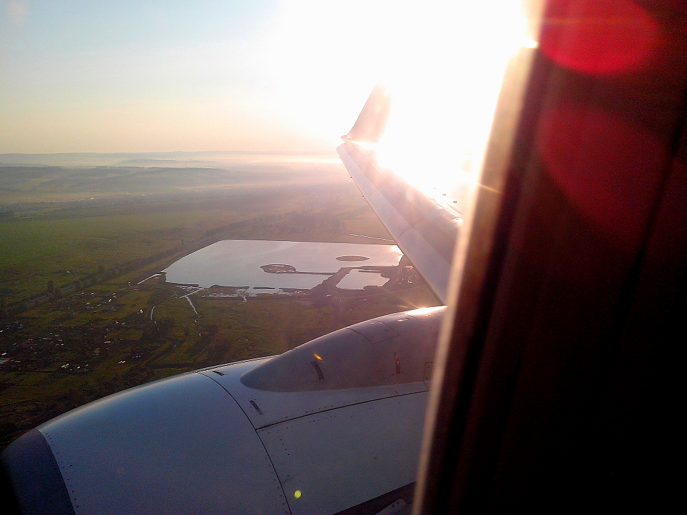 В 10 30 по Москве и в 14 30 по местному, по курсу вырисовывается громадная ВПП Подкаменной Тунгуски. В кадр и в нос попало немного выхлопных газов, потому слегка смазано :D