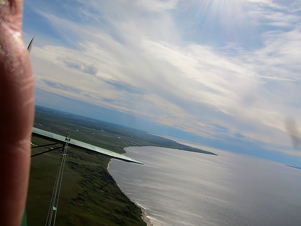В подтверждении активного судоходства прошлых лет, замытые песком и выброшенные на берег встречаются корабли Здесь по берегам Енисея, много брошенных зимовок и бывших рыболовецких баз, колхозов. Вот под нами одно из таких оставленных поселений. В восемнадцатом веке здесь было старинное русское зимовье Троицкое, в нем останавливались участники Великой Северной экспедиции, а руководители отрядов Семен Челюскин, Харитон Лаптев, Дмитрий Овцын заносили их на первые карты Енисейского залива По-2 постепенно приближается к бухте Сопочная Карга Я говорю Павлу по переговорному о полярной станции Соп.Карга, которая находится на краю одноименного мыса, острым ногтем закрывшим бухту от западных ветров Проходим прямо над домами, надо поддержать полярников! Знаю, что "полярка действует, одна из немногих из диксонского гидромета, что еще держится на плаву, в том числе благодаря мужеству работников Время полета, без пятнадцати минут, составляет 3 часа От Сопочной Карги до Диксона остается 200 километров, мы спрямляем маршрут и самолет послушно уходит от береговой черты в тундру