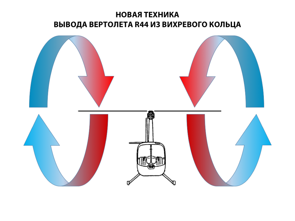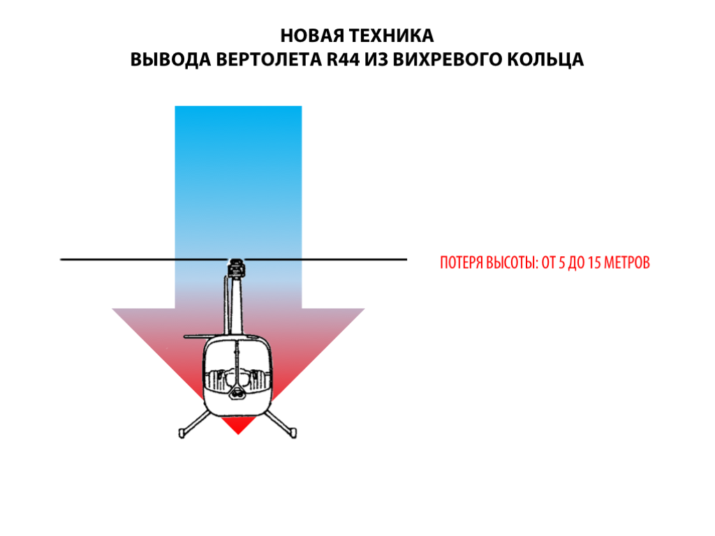 На мой взгляд такой метод предполагает более быструю реакцию вертолёта на действия органами управления. При выходе путем разгона вертолёта вперед, время достаточно велико из-за малой эффективности НВ в режиме РВК. РВ при этом работает в нормальном режиме и энергичная перекладка педалей помогает за меньшее время соскользнуть с бублика РВК.