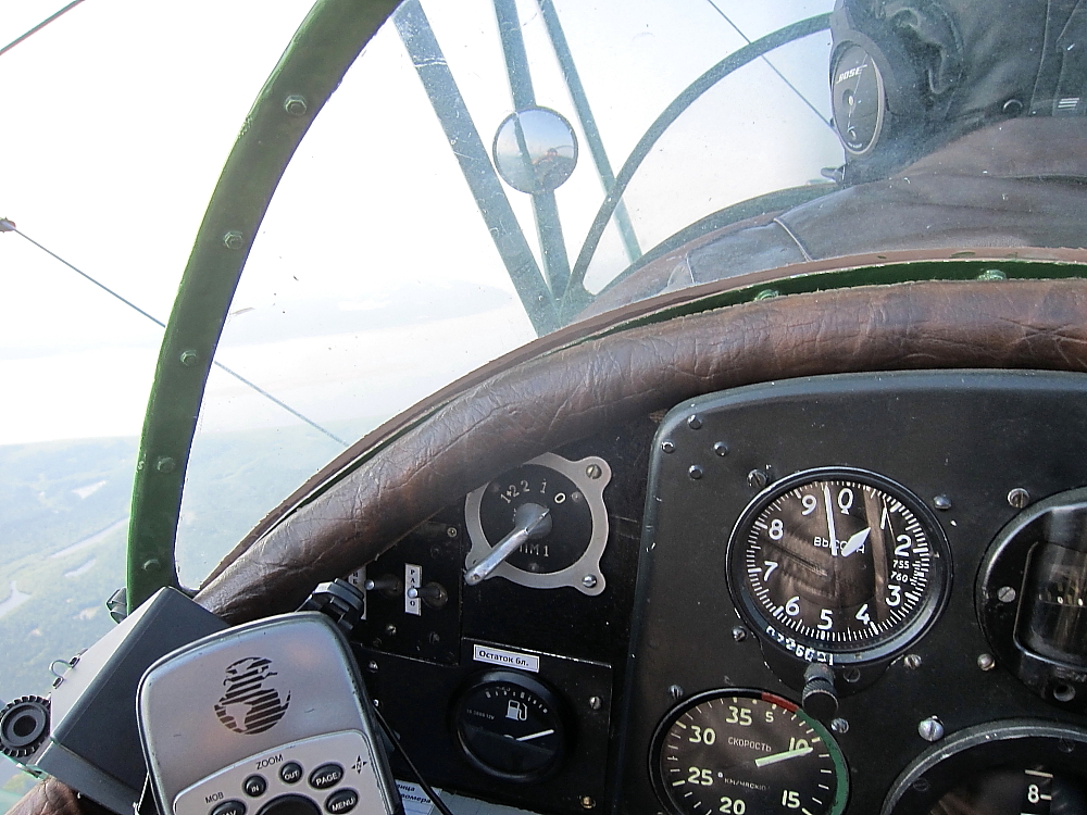 А жаркая погода продолжает влиять на полет исторических самолетов, медленно в течении часа набрали почти километр высоты, имея скорость чуть больше 100км/час Земля и Енисей на такой высоте поддернуты дымкой, но дышится легко. Нас догоняет экипаж Катаны, у ребят скорость практически в 2 раза быстрее нашей. Вспомнились слова Евгения, чтобы поравняться с По-2 и удержаться в воздухе Катана летит с выпущенными закрылками! Время полета 1 час 35 минут, под нами река Бахта, небольшой поселок из-за высоты невозможно рассмотреть, но если бы мог то спустился чтобы пожать руку родне Тарковского и многим обычным сибирякам, которых можно увидеть в этом замечательном небольшом видео