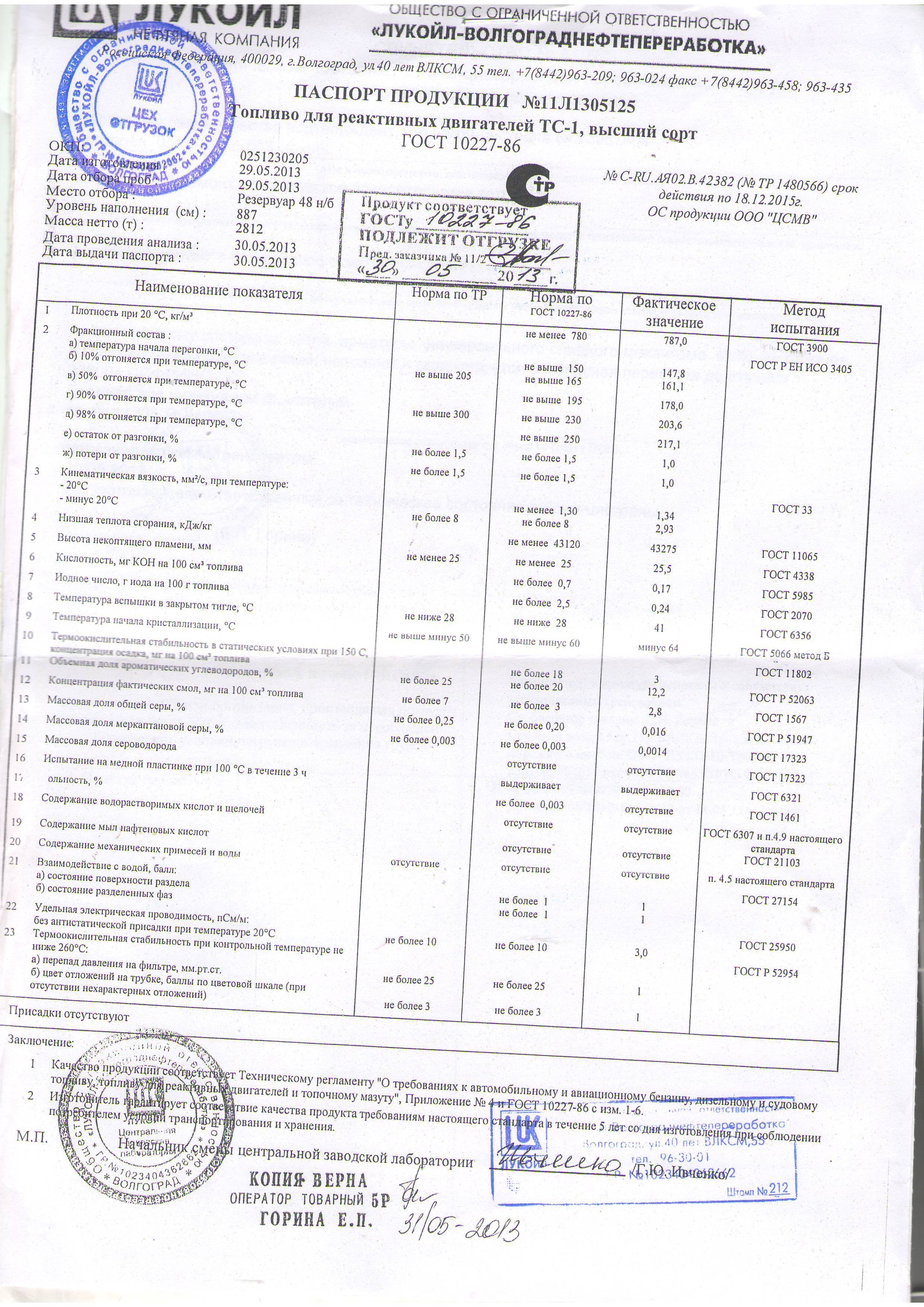 • ТС-1 и РТ (ГОСТ 10227), Jet А-1 (ГОСТ Р 52050, ASTM D 1655 DEF STAN 91-91 DCSEA 134), Jet A (ASTM D 1655)