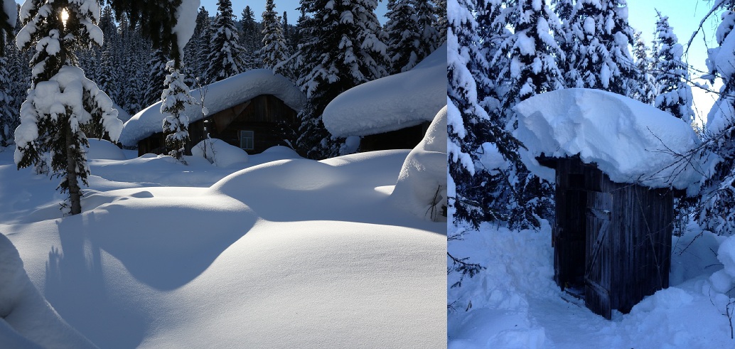 В таких домиках вместо шалашей живут современные пациенты источника. Удобства "унисекс" на улице. И на деликатном удалении (метров 50 в глубь тайги).