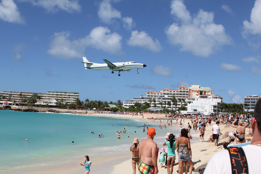 На подходе к полосе , перед нами было пару борот и мы ждали своей очереди. И вот торжественный момент наступил! Мы заходили на один из самых известных и красивых аэродромов. Перед нами была бухта , справа и слева закрытая островной частью, в самом центре бухры был небольшой узкий пляж, шириной наверное метров 20 и сразу же за ним начинался торец полосы. Сам пляж был тоже коротким, ну может метров 150. С одной стороны пляжа стояла большая кафешка с огромной терассой полностью забитая туристами, с другой стороны пляжа были постройки похожие на отель. Мы достали свои видео-фото принадлежности и начали снимать. Как вы понимаете миг счастья длился всего несколько секунд, мы пролетели над пляжем и через мгновение коснулись полосы, дальше все было уже привычно,- руление, парковка … Мы достигли своей конечной точки!