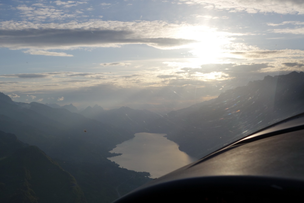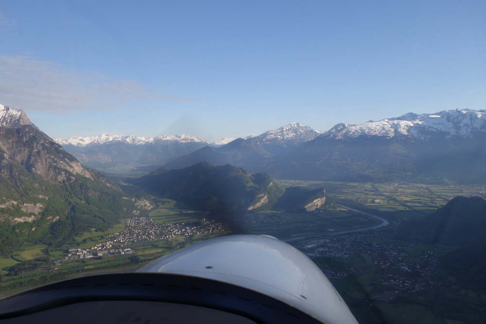 Взлёт из Wangen Lachen. LSPV-LSZE "рулил" я Над Цюрихским озером Взгляд назад. Забираемся к горе http://www.saentisbahn.ch/en.html Säntis У этого ряда пиков интересное название, но я его забыл. Я. Самолёт как-то с трудом забирался, всё же мощщи не так много. Спасибо знакомому за возможность полетать в горах - я всё ещё чувствовал себя слегка с дискомфортом За горой, в долине - соеднее государство. Лихтенштейн. Разворот в нужную долину. И на спуск. Весьма заковыристый заход на посадку. С одной стороны - холм с замком, из-за которого глиссада достаточно высоко; с другой стороны - лес и высоковольтные провода. Как там пипль летает в жаркий летний день, да ешё с http://en.wikipedia.org/wiki/Foehn_wind фёном Final Тот самый замок. Взгляд с конца полосы. Фактически, final approach был в развороте. Die Russen sind da! Таким образом, мы сделали небольшой крюк, чтобы облететь Säntis. Дорога обратно - через Wallensee, Sattelegg, Ägerisee.